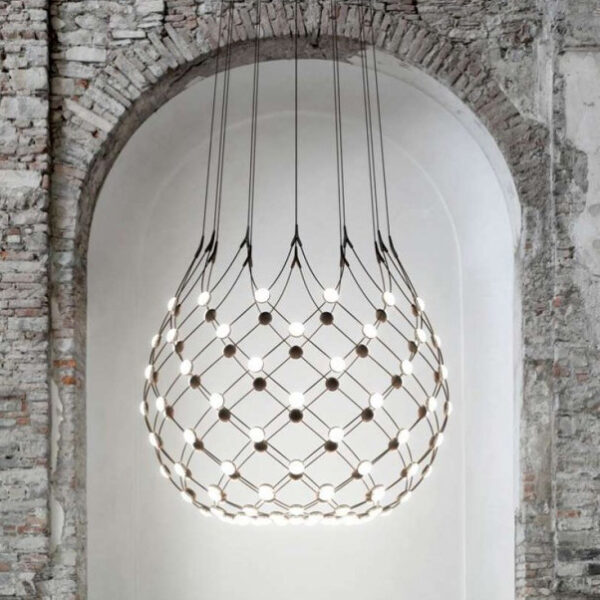 Una lampada dal forte impatto scenografico, la cui struttura leggera, quasi trasparente, composta da una rete di cavi flessibili all’incrocio dei quali sono posizionate le sorgenti LED, nasconde le complessità del progetto e, smaterializzandosi, lascia spazio soltanto alla luce, unica e vera protagonista. La sospensione Mesh garantisce una distribuzione ottimale della luce negli ambienti.